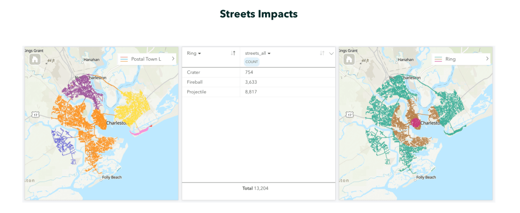 This project examines the impacts of a 100-meter diameter stoney meteor striking downtown Charleston, South Carolina. Three impact zones or “rings” resulting from the strike are calculated in Microsoft Excel with data from ImpactEarth and visualized with ArcGIS Pro; the rings are the crater, the fireball blast, and the projectile range. The crater and the fireball rings were noted to decimate anything within them. To get a further idea of the impact of the meteor by ring, data characterizing the rings including demographics, business information, municipalities, wetlands, bodies of water, streets, parcels, and streams were collected. These data were then processed in ArcGIS Pro using ModelBuilder and clipping tools to be characterized for each respective ring. These data were the visualized with ArcGIS Insights and an ArcGIS Instant App.