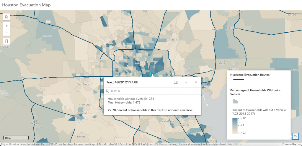 Demographics and hazards data was used to map evacuation routes for Houston, Texas and collect the number of vehicles and households in population blocks in the area. Using these data with ESRI tools such as ArcPro and ArcGIS Online, this interactive Web App was designed to display the risk of specific population block groups for evacuation.